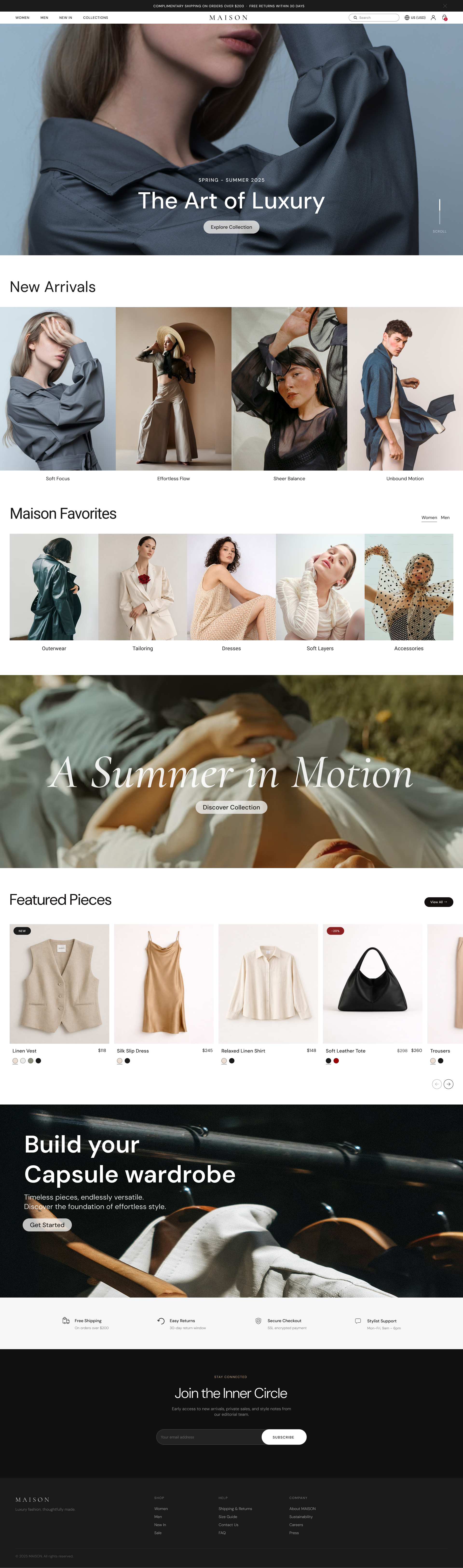 This fashion e-commerce landing page is designed to deliver a premium and immersive shopping experience, combining elegant visuals with a clear and intuitive user flow. The design emphasizes minimalism, refined typography, and high-quality imagery to reflect a modern luxury brand identity.